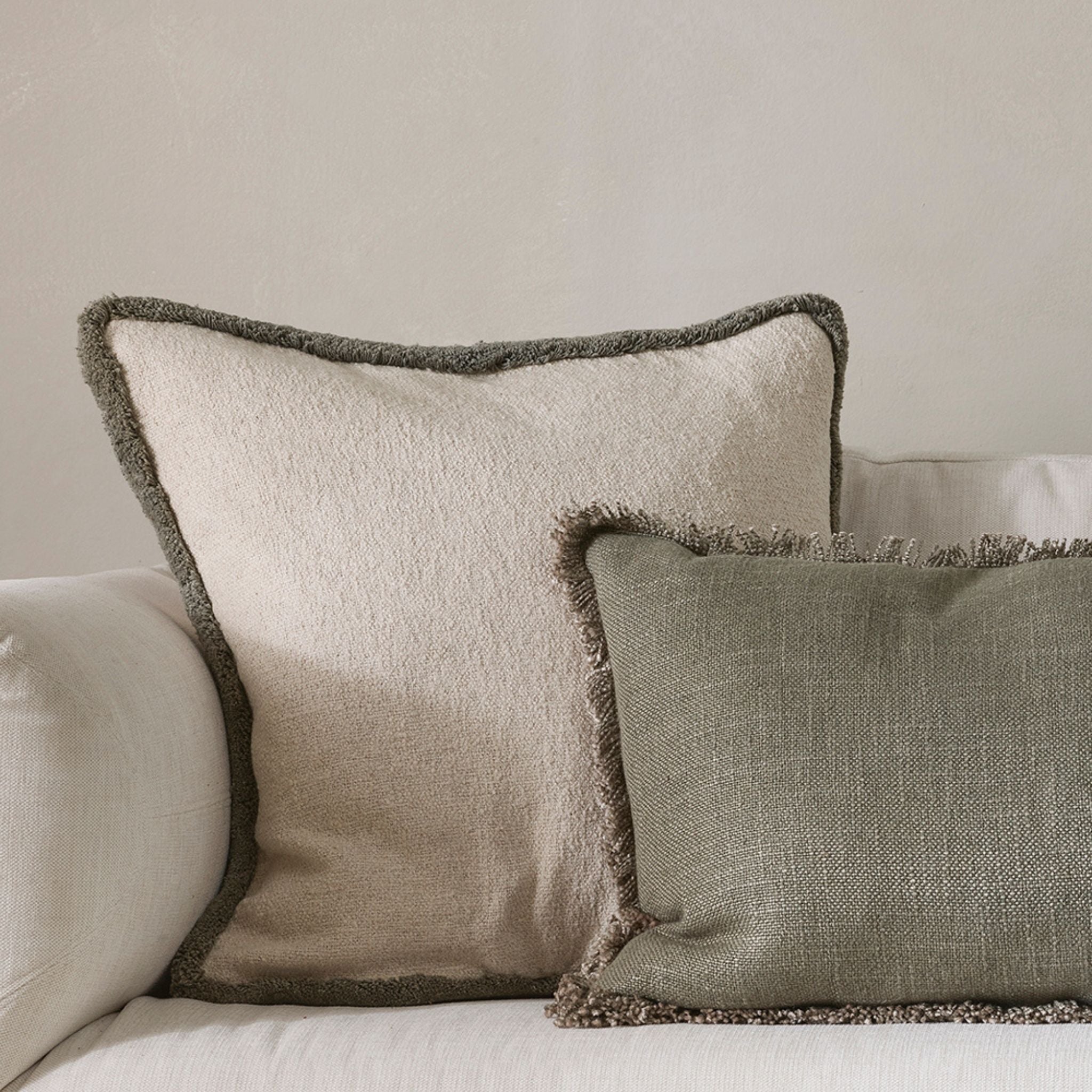 Featuring a soft, off-white bouclé base framed by a chunky cotton fringe, the Darcy cushion’s generous size and inviting texture is designed effortless layering. Made from a blend of cotton and recycled polyester, the sage-toned fringe adds a subtle element of colour that adds depth and contrast to cushion pairings.