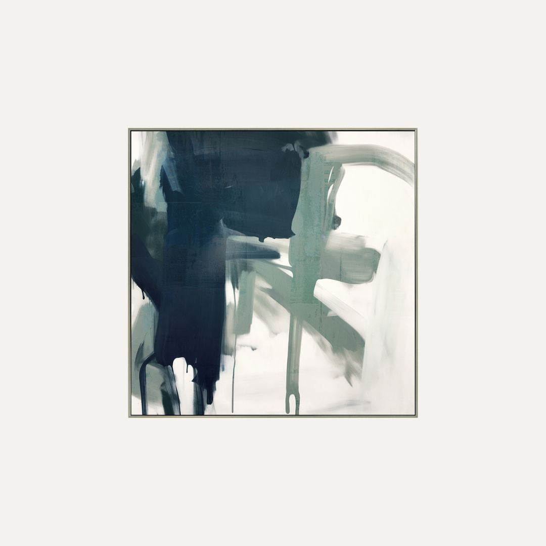 Abstract Moss V2 continues the layered, expressive language of the Abstract Moss collection. Deep blue and muted moss tones are softened by light, airy brushwork, creating a dynamic yet balanced composition. The interplay of bold strokes and gentle movement gives the artwork a calm, modern presence.