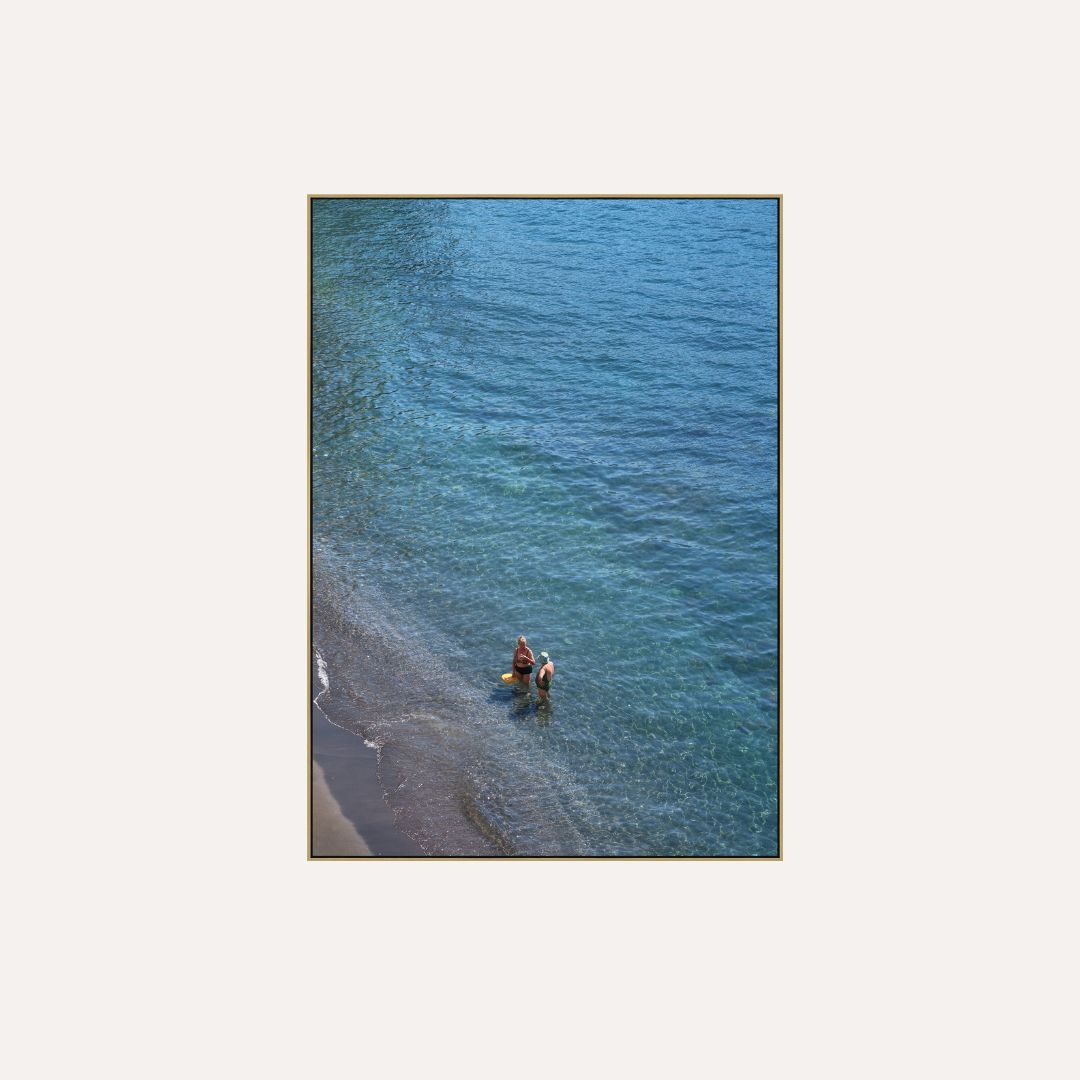 Seaside Ladies is a Mediterranean-inspired coastal wall art print capturing a quiet, intimate moment by the water’s edge. Two figures stand in crystal-clear shallows where soft waves meet the shore, creating a gentle, contemplative scene that evokes simplicity, connection, and slow coastal living. The layered blue tones bring a sense of calm and timeless seaside charm.