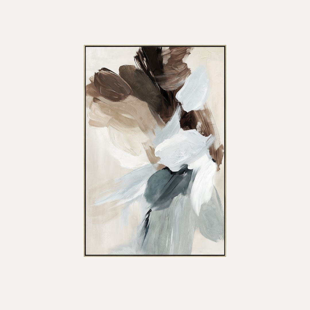 Twilight is a contemporary abstract artwork inspired by the soft transition between day and night. Layered brushstrokes in warm taupe, deep brown, misty grey, and soft white create a sense of movement and quiet depth. The interplay of light and shadow gives the piece a calm, atmospheric presence.